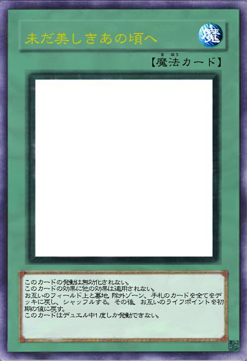 | このカードの発動は無効化されない。 このカードの効果に他の効果は適用されない。 お互いのフィールド上と墓地,除外ゾーン、手札のカードを全てをデッキに戻し、シャッフルする。その後、お互いのライフポイントを初期の値に戻す。 このカードはデュエル中1度しか発動できない。 | |||