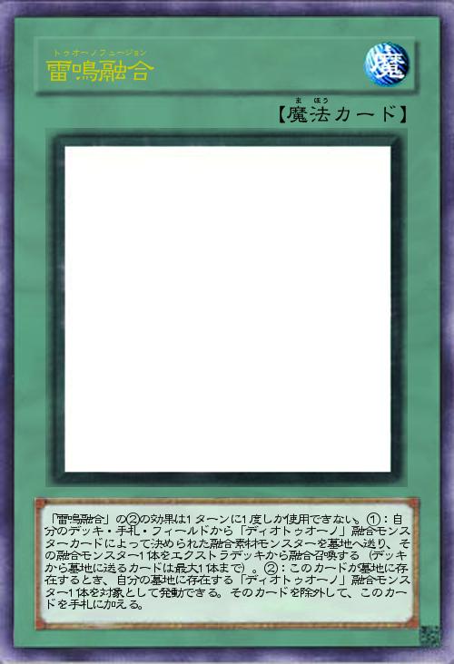 | 「雷鳴融合」の②の効果は1ターンに1度しか使用できない。①:自分のデッキ・手札・フィールドから「ディオトゥオーノ」融合モンスターカードによって決められた融合素材モンスターを墓地へ送り、その融合モンスター1体をエクストラデッキから融合召喚する(デッキから墓地に送るカードは最大1体まで)。②:このカードが墓地に存在するとき、自分の墓地に存在する「ディオトゥオーノ」融合モンスター1体を対象として発動できる。そのカードを除外して、このカードを手札に加える。 | |||
