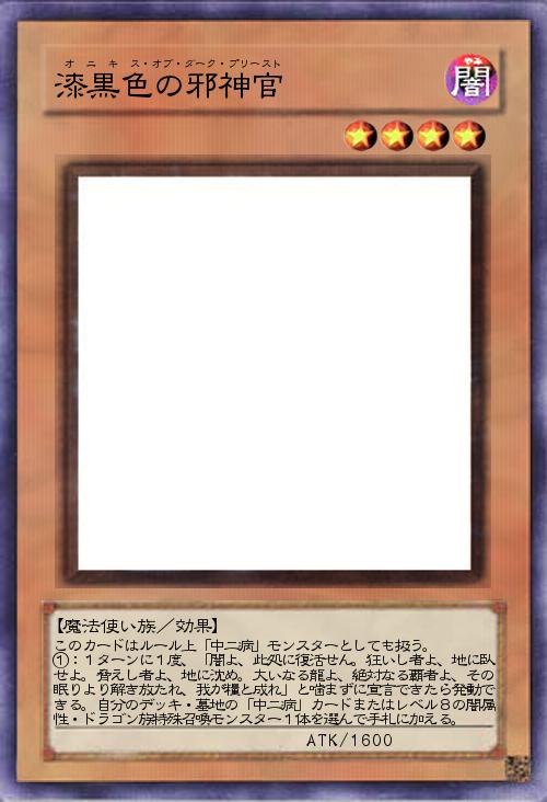 | このカードはルール上「中二病」モンスターとしても扱う。 ①:1ターンに1度、「闇よ、此処に復活せん。狂いし者よ、地に臥せよ。脅えし者よ、地に沈め。大いなる龍よ、絶対なる覇者よ、その眠りより解き放たれ、我が糧と成れ」と噛まずに宣言できたら発動できる。自分のデッキ・墓地の「中二病」カードまたはレベル8の闇属性・ドラゴン族特殊召喚モンスター1体を選んで手札に加える。 | |||