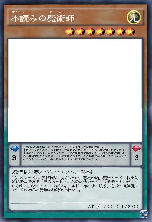 | 「本読みの魔術師」のP効果は1ターンに1度しか発動できない。 ①Pゾーンのこのカードを破壊して発動できる。デッキから「魔術師」Pモンスター1体を手札に加え、エクストラデッキに表側表示で存在する「本読みの魔術師」以外の「魔術師」Pモンスター1体を手札に加える。この効果でエクストラデッキから手札に加えたカードは、手札に加えたターンには発動できない。 | |||