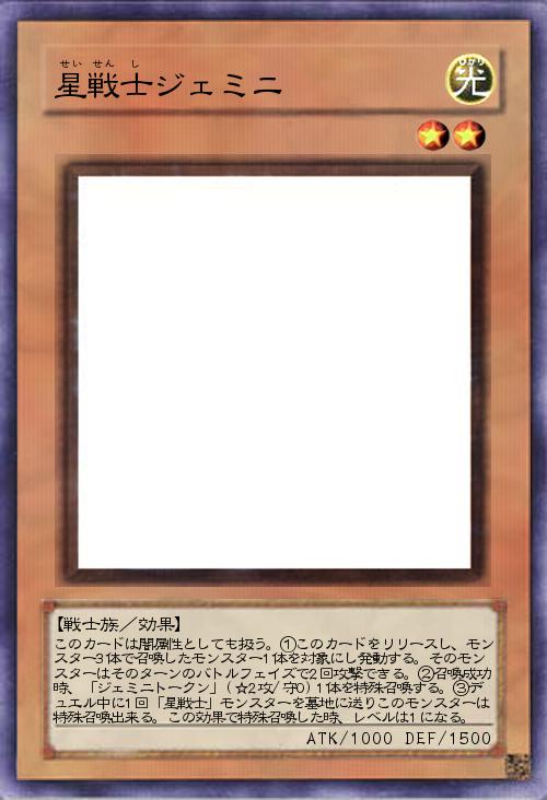 | このカードは闇属性としても扱う。①このカードをリリースし、モンスター3体で召喚したモンスター1体を対象にし発動する。そのモンスターはそのターンのバトルフェイズで2回攻撃できる。②召喚成功時、「ジェミニトークン」(☆2攻/守0)1体を特殊召喚する。③デュエル中に1回「星戦士」モンスターを墓地に送りこのモンスターは特殊召喚出来る。この効果で特殊召喚した時、レベルは1になる。 | |||