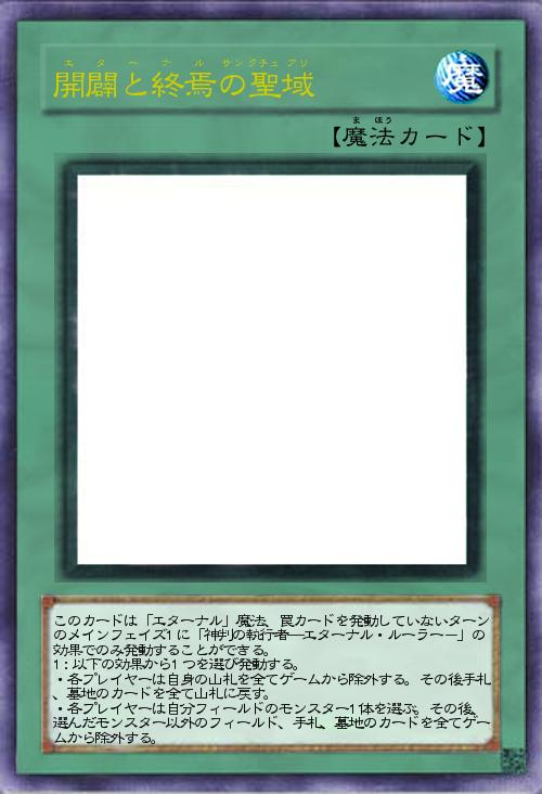 | このカードは「エターナル」魔法、罠カードを発動していないターンのメインフェイズ1に「神判の執行者―エターナル・ルーラー-」の効果でのみ発動することができる。 1:以下の効果から1つを選び発動する。 ・各プレイヤーは自身の山札を全てゲームから除外する。その後手札、墓地のカードを全て山札に戻す。 ・各プレイヤーは自分フィールドのモンスター1体を選ぶ。その後、選んだモンスター以外のフィールド、手札、墓地のカードを全てゲームから除外する。 | |||