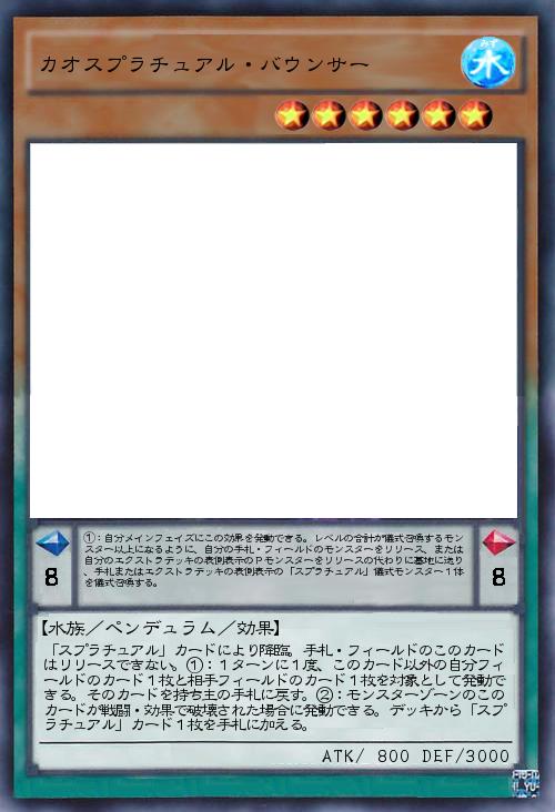 | ①:自分メインフェイズにこの効果を発動できる。レベルの合計が儀式召喚するモンスター以上になるように、自分の手札・フィールドのモンスターをリリース、または自分のエクストラデッキの表側表示のPモンスターをリリースの代わりに墓地に送り、手札またはエクストラデッキの表側表示の「スプラチュアル」儀式モンスター1体を儀式召喚する。 | |||