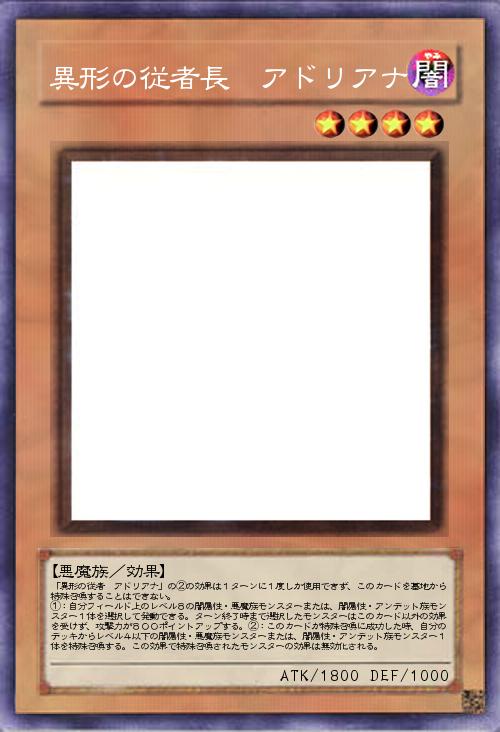 | 「異形の従者 アドリアナ」の②の効果は1ターンに1度しか使用できず、このカードを墓地から特殊召喚することはできない。 ①:自分フィールド上のレベル8の闇属性・悪魔族モンスターまたは、闇属性・アンデット族モンスター1体を選択して発動できる。ターン終了時まで選択したモンスターはこのカード以外の効果を受けず、攻撃力が800ポイントアップする。②:このカードが特殊召喚に成功した時、自分のデッキからレベル4以下の闇属性・悪魔族モンスターまたは、闇属性・アンデット族モンスター1体を特殊召喚する。この効果で特殊召喚されたモンスターの効果は無効化される。 | |||