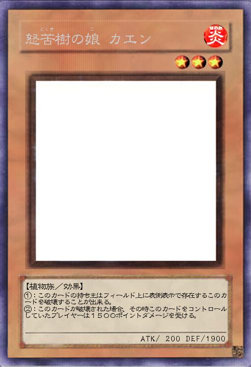 | ①:このカードの持ち主はフィールド上に表側表示で存在するこのカードを破壊することが出来る。 ②:このカードが破壊された場合、その時このカードをコントロールしていたプレイヤーは1500ポイントダメージを受ける。 | |||