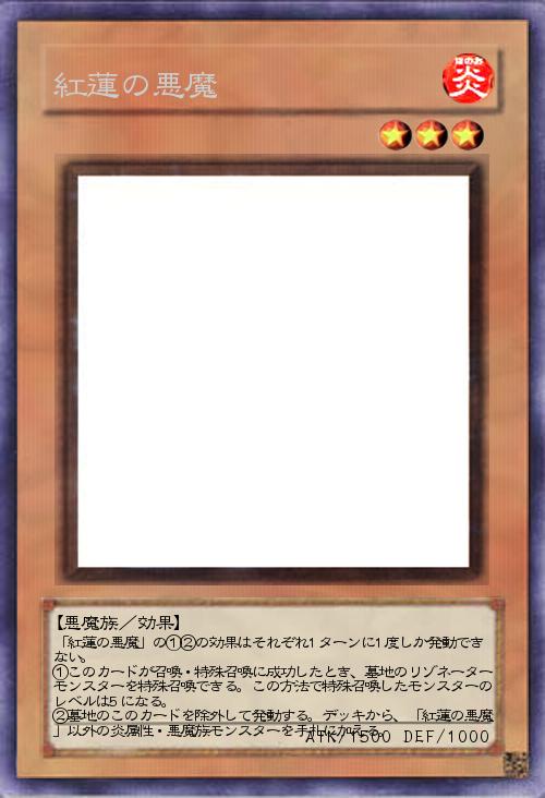 | 「紅蓮の悪魔」の①②の効果はそれぞれ1ターンに1度しか発動できない。 ①このカードが召喚・特殊召喚に成功したとき、墓地のリゾネーターモンスターを特殊召喚できる。この方法で特殊召喚したモンスターのレベルは5になる。 ②墓地のこのカードを除外して発動する。デッキから、「紅蓮の悪魔」以外の炎属性・悪魔族モンスターを手札に加える。 | |||