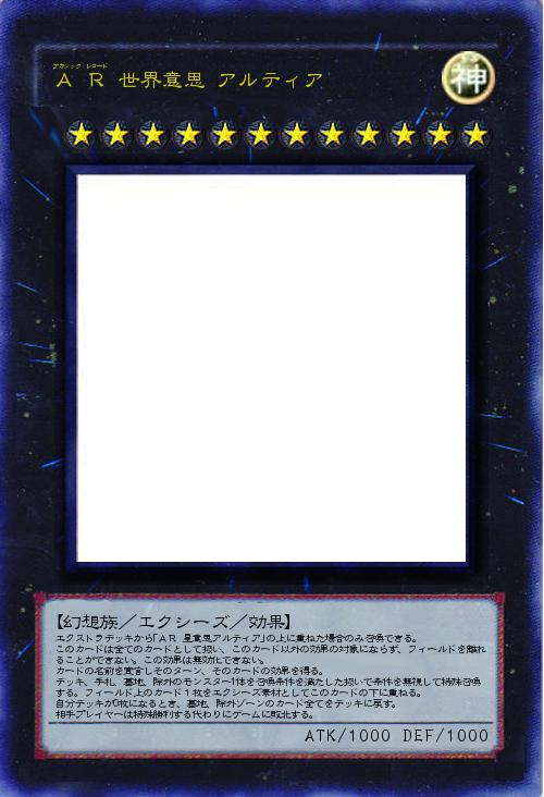 | エクストラデッキから「AR 星意思アルティア」の上に重ねた場合のみ召喚できる。 このカードは全てのカードとして扱い、このカード以外の効果の対象にならず、フィールドを離れることができない。この効果は無効化できない。 カードの名前を宣言しそのターン、そのカードの効果を得る。 デッキ、手札、墓地、除外のモンスター1体を召喚条件を満たした扱いで条件を無視して特殊召喚する。フィールド上のカード1枚をエクシーズ素材としてこのカードの下に重ねる。 自分デッキが0枚になるとき、墓地、除外ゾーンのカード全てをデッキに戻す。 相手プレイヤーは特殊勝利する代わりにゲームに敗北する。 | |||
