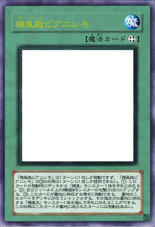 | 「機皇廠ピアニシモ」は1ターンに1枚しか発動できず、「機皇廠ピアニシモ」の③の効果は1ターンに1度しか使用できない。①:このカードの発動時にデッキから「機皇」モンスター1体を手札に加える。②:自分フィールド上の機械族モンスターの攻撃力は500アップする。③:このカードが墓地に存在する場合に発動できる。 墓地のこのカードをデッキに加えてシャッフルする。その後自分の墓地に存在する「機皇兵」モンスター1体を選んで手札に加えることができる。この効果はこのカードが墓地に送られたターンには発動出来ない。 | |||