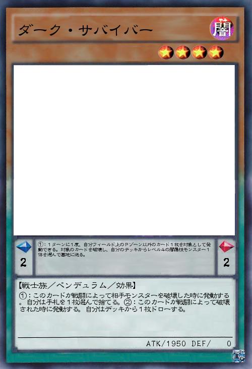 | ①:1ターンに1度、自分フィールド上のPゾーン以外のカード1枚を対象として発動できる。対象のカードを破壊し、自分のデッキからレベル4の闇属性モンスター1体を選んで墓地に送る。 | |||