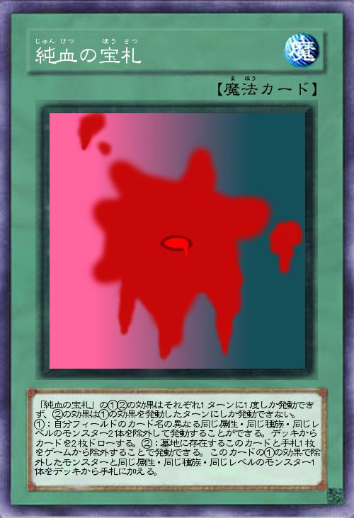 | 「純血の宝札」の①②の効果はそれぞれ1ターンに1度しか発動できず、②の効果は①の効果を発動したターンにしか発動できない。 ①:自分フィールドのカード名の異なる同じ属性・同じ種族・同じレベルのモンスター2体を除外して発動することができる。デッキからカードを2枚ドローする。②:墓地に存在するこのカードと手札1枚をゲームから除外することで発動できる。このカードの①の効果で除外したモンスターと同じ属性・同じ種族・同じレベルのモンスター1体をデッキから手札に加える。 | |||