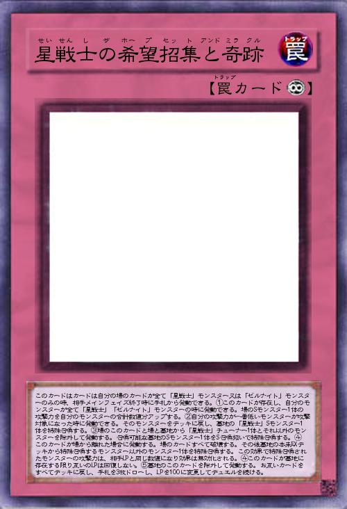 | このカードはカードは自分の場のカードが全て「星戦士」モンスター又は「ゼルナイト」モンスターのみの時、相手メインフェイズ終了時に手札から発動できる。①このカードが存在し、自分のモンスターが全て「星戦士」「ゼルナイト」モンスターの時に発動できる。場のSモンスター1体の攻撃力を自分のモンスターの合計数値分アップする。②自分の攻撃力が一番低いモンスターが攻撃対象になった時に発動できる。そのモンスターをデッキに戻し、墓地の「星戦士」Sモンスター1体を特殊召喚する。③場のこのカードと場と墓地から「星戦士」チューナー1体とそれ以外のモンスターを除外して発動する。召喚可能な墓地のSモンスター1体をS召喚扱いで特殊召喚する。④このカードが場から離れた場合に発動する。場のカードすべて破壊する。その後墓地の本来EXデッキから特殊召喚するモンスター以外のモンスター1体を特殊召喚する。この効果で特殊召喚されたモンス | |||