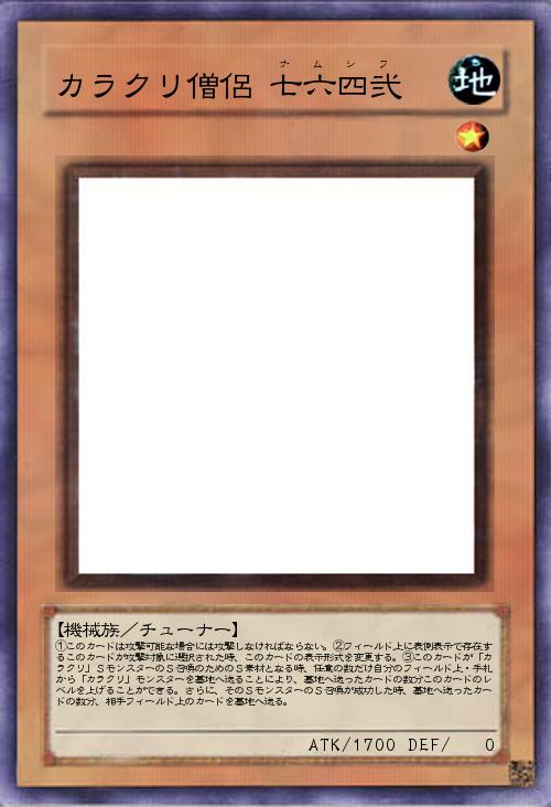 | ①このカードは攻撃可能な場合には攻撃しなければならない。②フィールド上に表側表示で存在するこのカードが攻撃対象に選択された時、このカードの表示形式を変更する。③このカードが「カラクリ」SモンスターのS召喚のためのS素材となる時、任意の数だけ自分のフィールド上・手札から「カラクリ」モンスターを墓地へ送ることにより、墓地へ送ったカードの数分このカードのレベルを上げることができる。さらに、そのSモンスターのS召喚が成功した時、墓地へ送ったカードの数分、相手フィールド上のカードを墓地へ送る。 | |||