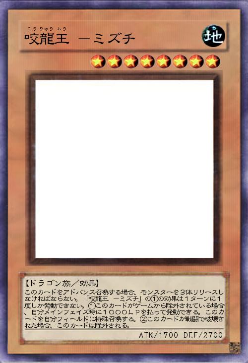 | このカードをアドバンス召喚する場合、モンスターを3体リリースしなければならない。「咬龍王 -ミズチ」の①の効果は1ターンに1度しか発動できない。①このカードがゲームから除外されている場合、自分メインフェイズ時に1000LPを払って発動できる。このカードを自分フィールドに特殊召喚する。②このカードが戦闘で破壊された場合、このカードは除外される。 | |||