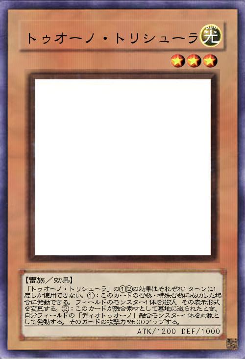 | 「トゥオーノ・トリシューラ」の①②の効果はそれぞれ1ターンに1度しか使用できない。①:このカードの召喚・特殊召喚に成功した場合に発動できる。フィールドのモンスター1体を選び、その表示形式を変更する。②:このカードが融合素材として墓地に送られたとき、自分フィールドの「ディオトゥオーノ」融合モンスター1体を対象として発動する。そのカードの攻撃力を500アップする。 | |||