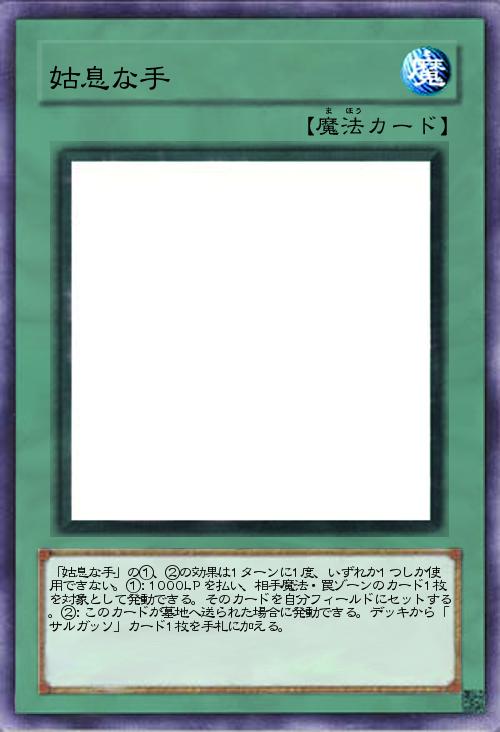 | 「姑息な手」の①、②の効果は1ターンに1度、いずれか1つしか使用できない。①:1000LPを払い、相手魔法・罠ゾーンのカード1枚を対象として発動できる。そのカードを自分フィールドにセットする。②:このカードが墓地へ送られた場合に発動できる。デッキから「サルガッソ」カード1枚を手札に加える。 | |||