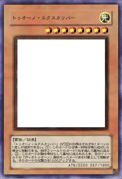 | 「トゥオーノ・エクスカリバー」の①②の効果はそれぞれ1ターンに1度しか使用できない。①:このカードの召喚・特殊召喚に成功した場合に発動できる。相手フィールドのカード1枚を選んで墓地に送る。②:このカードが融合素材として墓地に送られたとき、自分フィールドの「ディオトゥオーノ」融合モンスター1体を対象として発動する。そのカードの攻撃力を1000アップする。 | |||