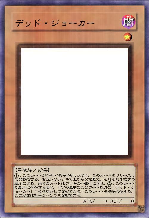 | ①:このカードが召喚・特殊召喚した場合、このカードをリリースして発動できる。お互いのデッキの上から2枚見て、それぞれ1枚ずつ墓地に送る。残りのカードはデッキの一番上に戻す。②:このカードが墓地に存在する場合、自分の墓地のこのカード以外の「デッド・ジョーカー」1枚を除外して発動できる。このカードを特殊召喚する。この効果は相手ターンでも発動できる。 | |||