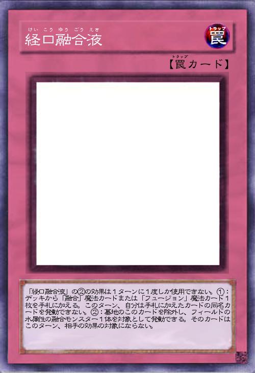 | 「経口融合液」の②の効果は1ターンに1度しか使用できない。①:デッキから「融合」魔法カードまたは「フュージョン」魔法カード1枚を手札に加える。このターン、自分は手札に加えたカードの同名カードを発動できない。②:墓地のこのカードを除外し、フィールドの水属性の融合モンスター1体を対象として発動できる。そのカードはこのターン、相手の効果の対象にならない。 | |||