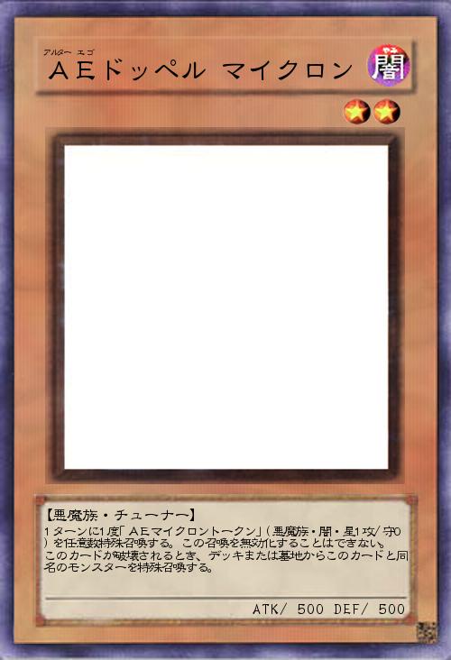 | 1ターンに1度「AEマイクロントークン」(悪魔族・闇・星1攻/守0)を任意数特殊召喚する。この召喚を無効化することはできない。 このカードが破壊されるとき、デッキまたは墓地からこのカードと同名のモンスターを特殊召喚する。 | |||