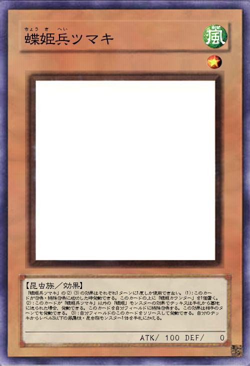 | 「蝶姫兵ツマキ」の(2)(3)の効果はそれぞれ1ターンに1度しか使用できない。(1):このカードが召喚・特殊召喚に成功した時発動できる。このカードの上に「蝶姫カウンター」を1個置く。(2):このカードが「蝶姫兵ツマキ」以外の「蝶姫」モンスターの効果でデッキ又は手札から墓地に送られた場合、発動できる。このカードを自分フィールドに特殊召喚する。この効果は相手のターンでも発動できる。(3):自分フィールドのこのカードをリリースして発動できる。自分のデッキからレベル3以下の風属性・昆虫族モンスター1体を手札に加える。 | |||