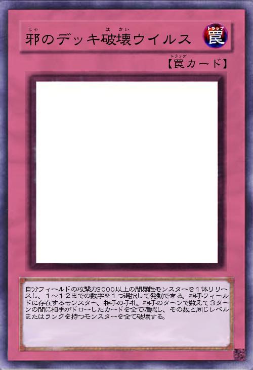 | 自分フィールドの攻撃力3000以上の闇属性モンスターを1体リリースし、1~12までの数字を1つ選択して発動できる。相手フィールドに存在するモンスター、相手の手札、相手のターンで数えて3ターンの間に相手がドローしたカードを全て確認し、その数と同じレベルまたはランクを持つモンスターを全て破壊する。 | |||