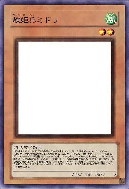 | 「蝶姫兵ミドリ」の(2)(3)の効果はそれぞれ1ターンに1度しか使用できない。(1):このカードが召喚・特殊召喚に成功した時発動できる。このカードの上に「蝶姫カウンター」を1個置く。(2):このカードが「蝶姫」モンスターの効果によって手札に加えられた場合手札のこのカードを相手に見せて発動できる。このカードを自分フィールドに特殊召喚する。その後、自分の手札1枚を選び、選んだカードを墓地に送る。(3):自分フィールドの「蝶姫カウンター」を2個取り除いて発動できる。自分のデッキから1枚ドローする。その後、自分の手札を2枚を選び、選んだカードを墓地に送る。 | |||