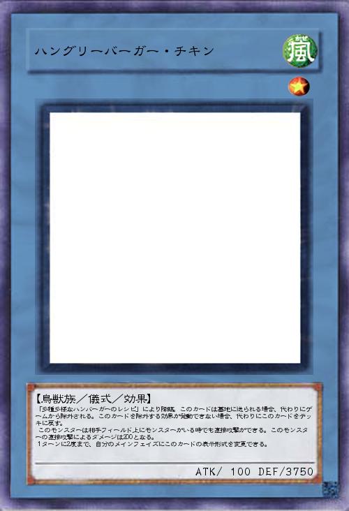 「ふみゅ、メイン1で攻撃表示に、メイン2で守備表示にできるのか。まさにチキン!!!!その具のチキンがフライして相手にダイレクトアタックするんでしょうね。(ダジャレ)」(2016-05-01 22:02)