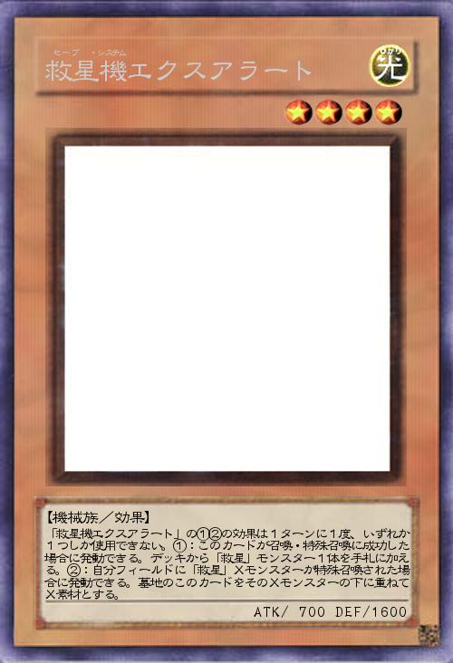 | 「救星機エクスアラート」の①②の効果は1ターンに1度、いずれか1つしか使用できない。①:このカードが召喚・特殊召喚に成功した場合に発動できる。デッキから「救星」モンスター1体を手札に加える。②:自分フィールドに「救星」Xモンスターが特殊召喚された場合に発動できる。墓地のこのカードをそのXモンスターの下に重ねてX素材とする。 | |||