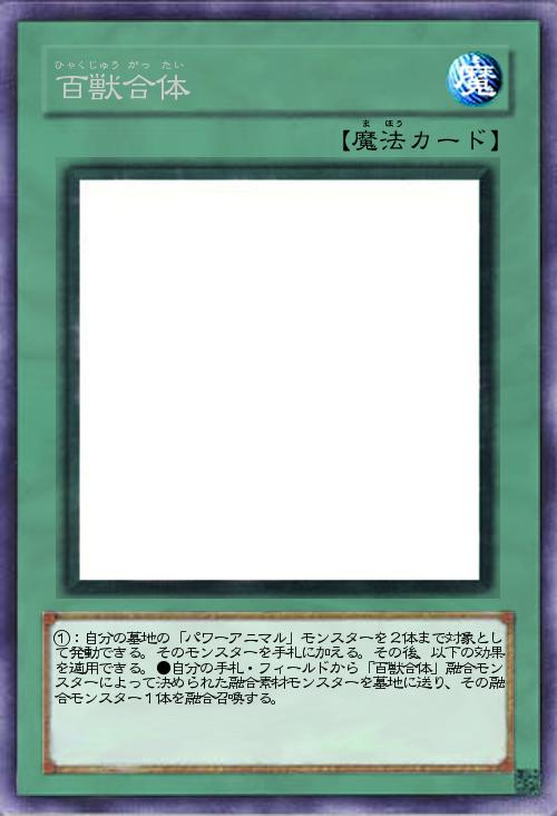 | ①:自分の墓地の「パワーアニマル」モンスターを2体まで対象として発動できる。そのモンスターを手札に加える。その後、以下の効果を適用できる。●自分の手札・フィールドから「百獣合体」融合モンスターによって決められた融合素材モンスターを墓地に送り、その融合モンスター1体を融合召喚する。 | |||