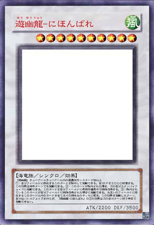 | 「遊幽龍」チューナー+チューナー以外の風属性モンスター2体以上 ①:自分フィールドに存在するこのカードを除外して発動できる。自分LPを2000回復する。この効果は相手ターンでも発動できる。②:このカードが除外された場合、次の自分スタンバイフェイズに発動できる。このカードを自分フィールドに表側守備表示で特殊召喚する。③:除外されているこのカードが自分フィールドに特殊召喚された場合に発動できる。お互いのフィールドに存在するこのカード以外のカードを全て元々の持ち主のデッキに戻す。この効果を発動したターン、自分はバトルフェイズを行えず、「遊幽龍-にほんばれ」の③の効果は次の自分ターン終了時まで発動できない。 | |||