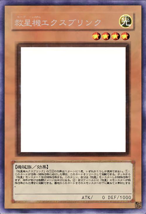 | 「救星機エクスブリンク」の①②の効果は1ターンに1度、いずれか1つしか使用できない。①:このカードが召喚・特殊召喚に成功した場合、このカードをリリースして発動できる。デッキから「救星」モンスター1体を特殊召喚する。このターン、自分は「救星」モンスターしか特殊召喚できず、相手が受ける戦闘ダメージは半分になる。②:自分フィールドに「救星」Xモンスターが特殊召喚された場合に発動できる。墓地のこのカードをそのXモンスターの下に重ねてX素材とする。 | |||