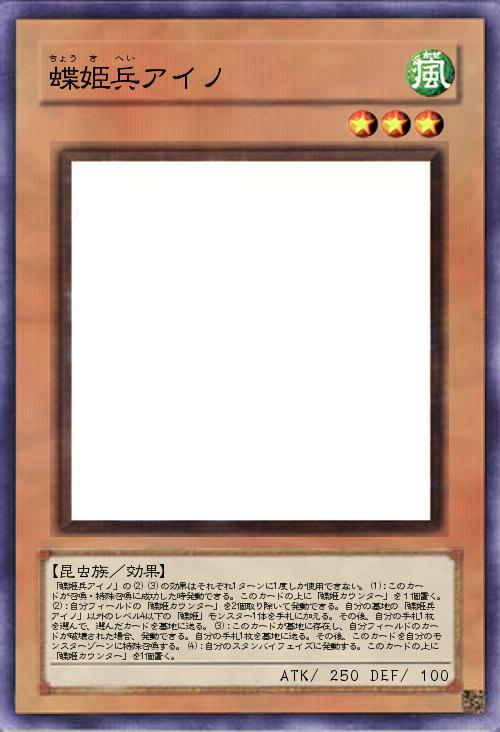 | 「蝶姫兵アイノ」の(2)(3)の効果はそれぞれ1ターンに1度しか使用できない。(1):このカードが召喚・特殊召喚に成功した時発動できる。このカードの上に「蝶姫カウンター」を1個置く。(2):自分フィールドの「蝶姫カウンター」を2個取り除いて発動できる。自分の墓地の「蝶姫兵アイノ」以外のレベル4以下の「蝶姫」モンスター1体を手札に加える。その後、自分の手札1枚を選んで、選んだカードを墓地に送る。(3):このカードが墓地に存在し、自分フィールドのカードが破壊された場合、発動できる。自分の手札1枚を墓地に送る。その後、このカードを自分のモンスターゾーンに特殊召喚する。(4):自分のスタンバイフェイズに発動する。このカードの上に「蝶姫カウンター」を1個置く。 | |||