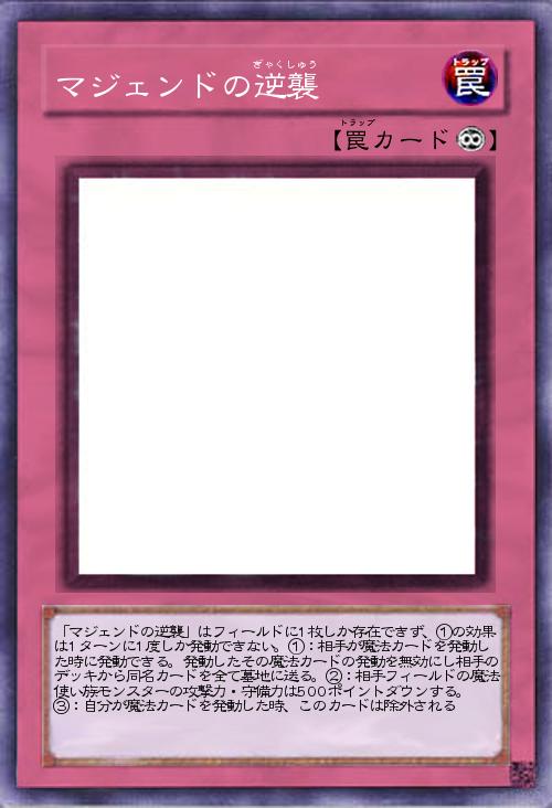 | 「マジェンドの逆襲」はフィールドに1枚しか存在できず、①の効果は1ターンに1度しか発動できない。①:相手が魔法カードを発動した時に発動できる。発動したその魔法カードの発動を無効にし相手のデッキから同名カードを全て墓地に送る。②:相手フィールドの魔法使い族モンスターの攻撃力・守備力は500ポイントダウンする。 ③:自分が魔法カードを発動した時、このカードは除外される | |||