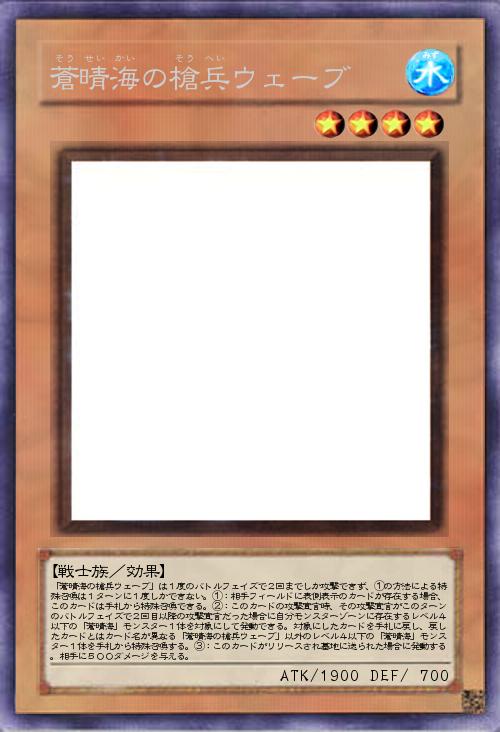 | 「蒼晴海の槍兵ウェーブ」は1度のバトルフェイズで2回までしか攻撃できず、①の方法による特殊召喚は1ターンに1度しかできない。①:相手フィールドに表側表示のカードが存在する場合、このカードは手札から特殊召喚できる。②:このカードの攻撃宣言時、その攻撃宣言がこのターンのバトルフェイズで2回目以降の攻撃宣言だった場合に自分モンスターゾーンに存在するレベル4以下の「蒼晴海」モンスター1体を対象にして発動できる。対象にしたカードを手札に戻し、戻したカードとはカード名が異なる「蒼晴海の槍兵ウェーブ」以外のレベル4以下の「蒼晴海」モンスター1体を手札から特殊召喚する。③:このカードがリリースされ墓地に送られた場合に発動する。相手に500ダメージを与える。 | |||