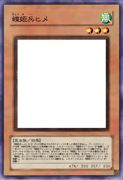 | 「蝶姫兵ヒメ」の(2)(3)の効果はそれぞれ1ターンに1度しか使用できない。(1):このカードが召喚・特殊召喚に成功した時発動できる。このカードの上に「蝶姫カウンター」を1個置く。(2):自分フィールドの「蝶姫カウンター」を2個取り除き手札1枚を墓地に送って発動できる。自分のデッキから1枚ドローする。その後、自分のデッキから「蝶姫」モンスター1体を墓地に送ることができる。(3):このカードがフィールドから墓地に送られた場合、自分のモンスターゾーンの「蝶姫」モンスター1体を対象にして発動できる。そのモンスターの上に「蝶姫カウンター」を2個置く。(4):自分のスタンバイフェイズに発動する。このカードの上に「蝶姫カウンター」を1個置く | |||