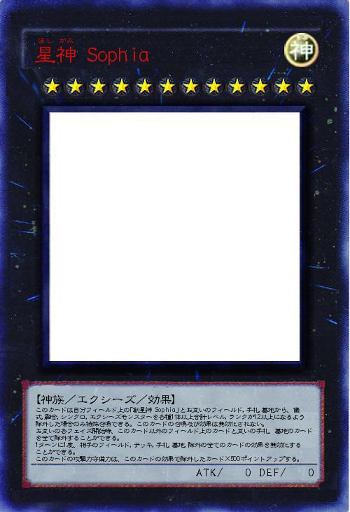 | このカードは自分フィールド上の「創星神 Sophia」とお互いのフィールド,手札,墓地から、儀式,融合,シンクロ,エクシーズモンスターを各種1体以上合計レベル,ランクが12以上になるよう除外した場合のみ特殊召喚できる。このカードの召喚及び効果は無効化されない。 お互いの各フェイズ開始時、このカード以外のフィールド上のカードと互いの手札、墓地のカードを全て除外することができる。 1ターンに1度、相手のフィールド,デッキ,手札,墓地,除外の全てのカードの効果を無効化することができる。 このカードの攻撃力守備力は、このカードの効果で除外したカード×500ポイントアップする。 | |||