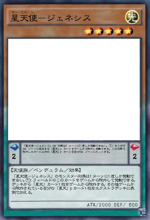 | 「星天使-ジェネシス」のモンスター効果は1ターンに1度しか発動できない。①:フィールドのこのカードをゲームから除外して発動できる。デッキから「星天」カード1枚をゲームから除外する。その後ゲームから除外されている自分の「星天」pカード1枚をエクストラデッキに表側で加える。 | |||