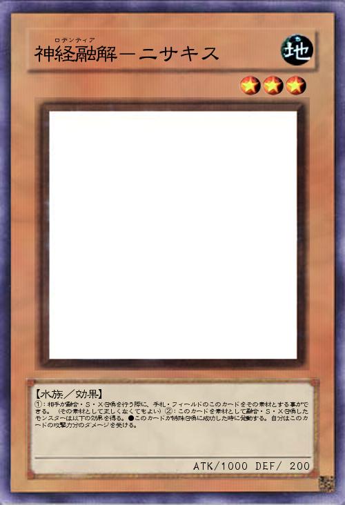 | ①:相手が融合・S・X召喚を行う際に、手札・フィールドのこのカードをその素材とする事ができる。(その素材として正しくなくてもよい)②:このカードを素材として融合・S・X召喚したモンスターは以下の効果を得る。●このカードが特殊召喚に成功した時に発動する。自分はこのカードの攻撃力分のダメージを受ける。 | |||