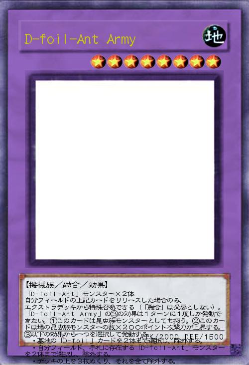 | 「D-foil-Ant」モンスター×2体 自分フィールドの上記カードをリリースした場合のみ、 エクストラデッキから特殊召喚できる(「融合」は必要としない)。 「D-foil-Ant Army」の③の効果は1ターンに1度しか発動できない。①このカードは昆虫族モンスターとしても扱う。②このカードは場の昆虫族モンスターの数×200ポイント攻撃力が上昇する。③以下の効果から一つを選択して発動する。 ・墓地の「D-foil」カードを2体まで選択し、除外する。 ・自分フィールド、手札に存在する「D-foil-Ant」モンスターを2体まで選択し、除外する。 ・デッキの上を3枚めくり、それを全て除外する。 | |||