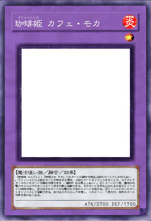 | 「珈琲娘 エスプレ」+「珈琲少女 ラテ」このカードの融合召喚は上記のカードでしか行えない。①フィールドに上記のカードが存在する場合、上記のカードをリリースすることで、エクストラデッキのこのカードを融合召喚できる(《融合》は必要としない)。②1ターンに1度、墓地の攻撃力500以下のモンスター1体を対象に発動できる。そのカードを手札に加えるか自分フィールドに特殊召喚し、自分はそのカードの攻撃力の3倍のダメージを受ける。③フィールドのこのカードをリリースして発動できる。自分は2500LP回復し、このターン、1度だけ、相手のカード効果を受けなくなる。 | |||