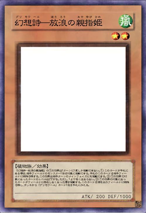 | 「幻想詩―放浪の親指姫」の①の効果は1ターンに1度しか発動できない。①:このカードが手札にある場合、相手フィールドのモンスター1体を対象に発動できる。手札のこのカードを相手フィールドに特殊召喚する。この効果は相手ターンのメインフェイズにも発動できる。②:①の効果で対象になったカードのレベルは2下がる。ただし、1より低くはならない。③:①の効果の対象になったカードがフィールドに存在しなくなった場合発動する。このカードを持ち主のフィールドに特殊召喚し、デッキから「グリモワール」カード1枚を手札に加える。 | |||