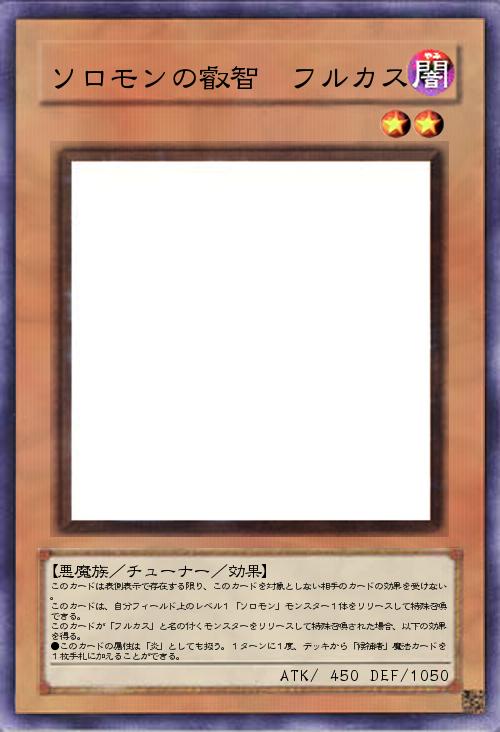 | このカードは表側表示で存在する限り、このカードを対象としない相手のカードの効果を受けない。 このカードは、自分フィールド上のレベル1「ソロモン」モンスター1体をリリースして特殊召喚できる。 このカードが「フルカス」と名の付くモンスターをリリースして特殊召喚された場合、以下の効果を得る。 ●このカードの属性は「炎」としても扱う。1ターンに1度、デッキから「候補者」魔法カード1を1枚手札に加えることができる。 | |||