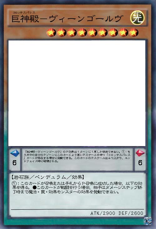 | 「巨神殿-ヴィーンゴールヴ」のP効果は1ターンに1度しか使用できない。①:もう片方の自分のPゾーンにこのカードより高いPスケールを持つ「コロッサスパレス」カードが存在する場合に発動できる。このカードのPスケールは4つ上がり、エンドフェイズ時に破壊される。 | |||