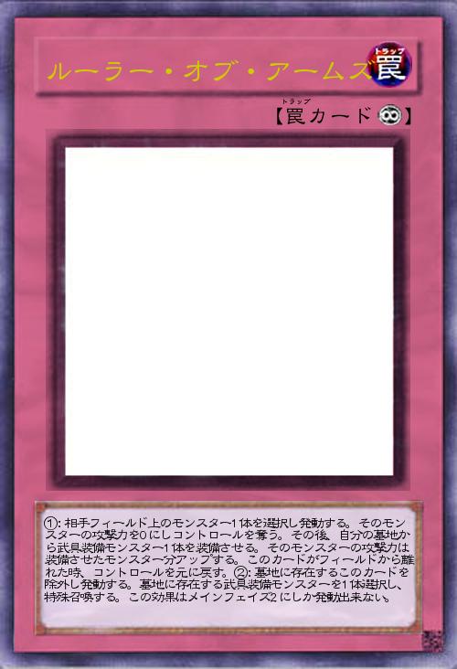 | ①:相手フィールド上のモンスター1体を選択し発動する。そのモンスターの攻撃力を0にしコントロールを奪う。その後、自分の墓地から武具装備モンスター1体を装備させる。そのモンスターの攻撃力は装備させたモンスター分アップする。このカードがフィールドから離れた時、コントロールを元に戻す。②:墓地に存在するこのカードを除外し発動する。墓地に存在する武具装備モンスターを1体選択し、特殊召喚する。この効果はメインフェイズ2にしか発動出来ない。 | |||