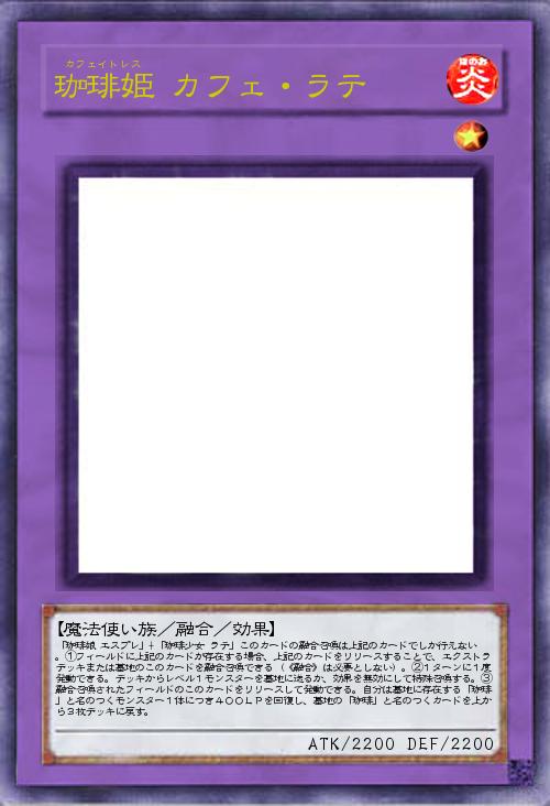 | 「珈琲娘 エスプレ」+「珈琲少女 ラテ」このカードの融合召喚は上記のカードでしか行えない。①フィールドに上記のカードが存在する場合、上記のカードをリリースすることで、エクストラデッキまたは墓地のこのカードを融合召喚できる(《融合》は必要としない)。②1ターンに1度発動できる。デッキからレベル1モンスターを墓地に送るか、効果を無効にして特殊召喚する。③融合召喚されたフィールドのこのカードをリリースして発動できる。自分は墓地に存在する「珈琲」と名のつくモンスター1体につき400LPを回復し、墓地の「珈琲」と名のつくカードを上から3枚デッキに戻す。 | |||