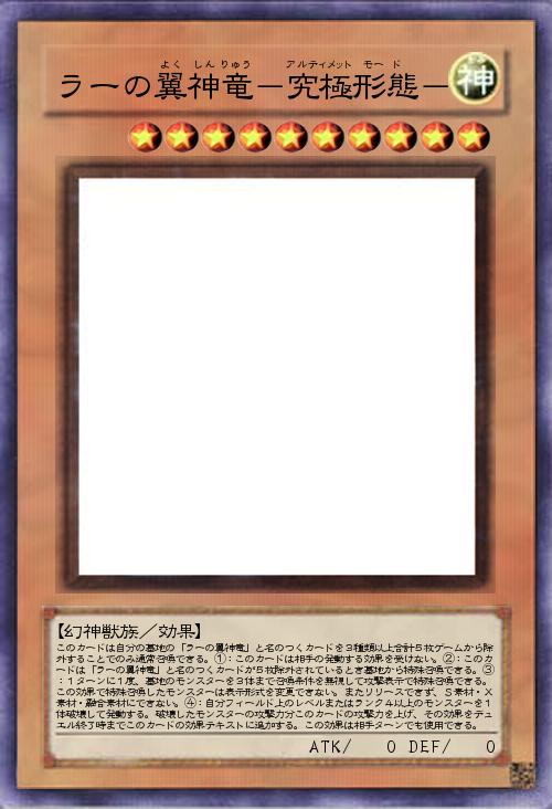| このカードは自分の墓地の「ラーの翼神竜」と名のつくカードを3種類以上合計5枚ゲームから除外することでのみ通常召喚できる。①:このカードは相手の発動する効果を受けない。②:このカードは「ラーの翼神竜」と名のつくカードが5枚除外されているとき墓地から特殊召喚できる。③:1ターンに1度、墓地のモンスターを3体まで召喚条件を無視して攻撃表示で特殊召喚できる。この効果で特殊召喚したモンスターは表示形式を変更できない。またリリースできず、S素材・X素材・融合素材にできない。④:自分フィールド上のレベルまたはランク4以上のモンスターを1体破壊して発動する。破壊したモンスターの攻撃力分このカードの攻撃力を上げ、その効果をデュエル終了時までこのカードの効果テキストに追加する。 | |||
