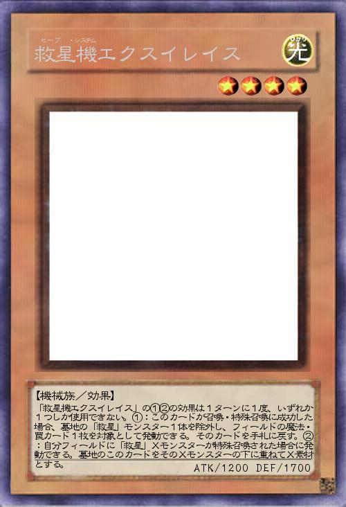 | 「救星機エクスイレイス」の①②の効果は1ターンに1度、いずれか1つしか使用できない。①:このカードが召喚・特殊召喚に成功した場合、墓地の「救星」モンスター1体を除外し、フィールドの魔法・罠カード1枚を対象として発動できる。そのカードを手札に戻す。②:自分フィールドに「救星」Xモンスターが特殊召喚された場合に発動できる。墓地のこのカードをそのXモンスターの下に重ねてX素材とする。 | |||