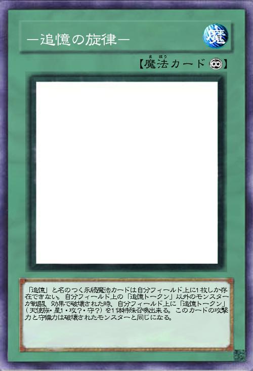| 「追憶」と名のつく永続魔法カードは自分フィールド上に1枚しか存在できない。自分フィールド上の「追憶トークン」以外のモンスターが戦闘、効果で破壊された時、自分フィールド上に「追憶トークン」(天使族・星1・攻?・守?)を1体特殊召喚出来る。このカードの攻撃力と守備力は破壊されたモンスターと同じになる。 | |||