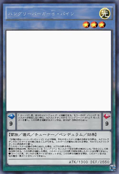| 1ターンに1度、自分のメインフェイズ1に発動できる。もう一方のPゾーンにPモンスターが存在しない時に、エクストラデッキから「ハングリーバーガー」Pモンスターを置く。この効果を発動するターン中は、自分はP召喚を行えない。 | |||