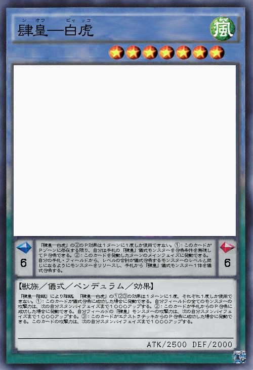 | 「肆皇―降臨」により降臨。「肆皇―白虎」の①②③の効果は1ターンに1度、それぞれ1度しか使用できない。①:このカードが儀式召喚に成功した場合に発動できる。自分フィールドの全てのモンスターの攻撃力は、次の自分スタンバイフェイズまで1000アップする。②:このカードが手札からのP召喚に成功した場合に発動できる。自分フィールドの「肆皇」モンスターの攻撃力は、次の自分スタンバイフェイズまで1000アップする。③:このカードがエクストラデッキからのP召喚に成功した場合に発動できる。このカードの攻撃力は、次の自分スタンバイフェイズまで1000アップする。 | |||